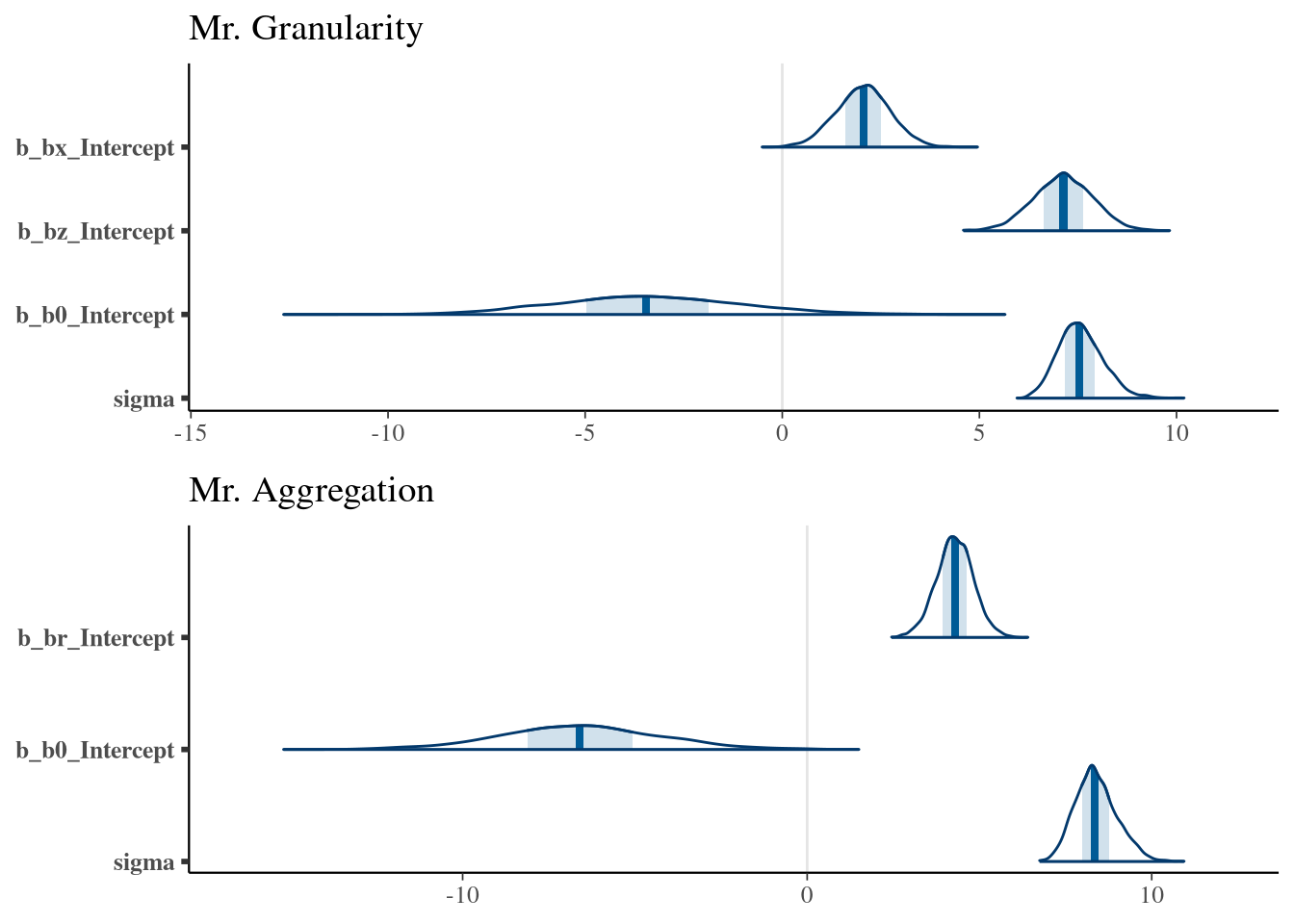 This means that Mr. Granularity wants to estimate a parameter for each of the two variables while Mr. Aggregation wants to estimate one parameter for the sum of \(x\) and \(z\).