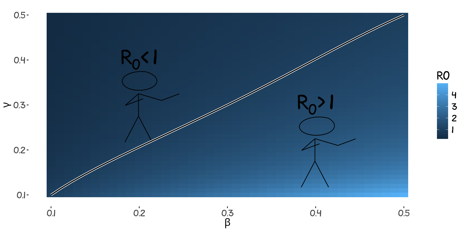 As you can see it only uses the parameters of the ODEs which means that we don’t have to solve the equations to get to \(R_0\). In our parameter setting referred to above we would have an \(R_0=2.8\). Just FYI, you really want this number to be below \(1\) or the infection will most likely continue to spread. A bit of algebra will show you that in order to maintain an \(R_0\) below \(1\) you need to keep \(\beta < \gamma\) which means