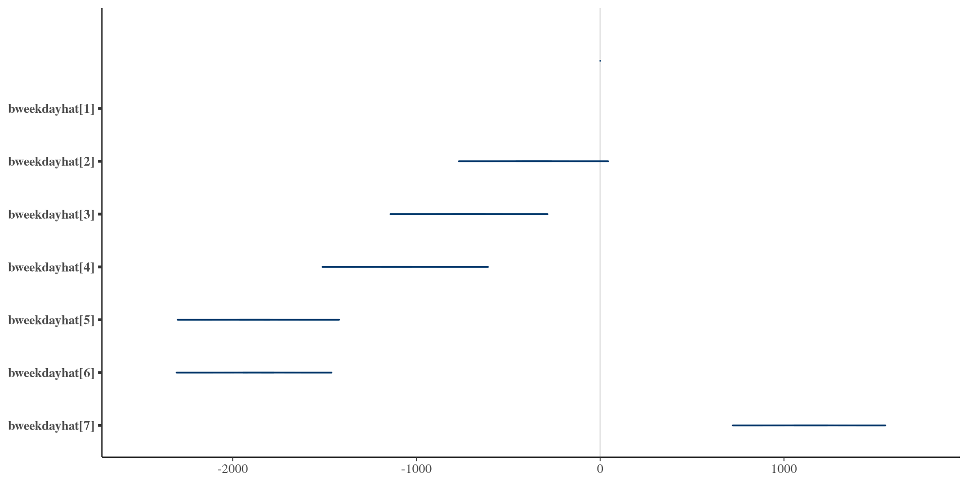 As you can see these estimates are quite different and to the naked eye makes more sense from what we know about the data set and what we can expect from intra-weekly effects. We can further check these estimates by inspecting the posteriors further. Note here the “bweekdayhat[1]” which is a delta distribution at 0. This serves as our baseline for the intra-week effect that we’re capturing. The x-axis in the plot are the estimated \(\beta_i\)’s and the y-axis for each parameter is the posterior probability density.