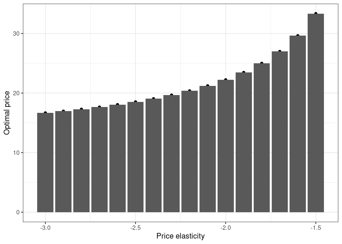 The neat thing about this function is that it’s vectorized by default, which means we can call it using single values or vectors. In the example below we calculate the optimal price based on different price elasticities. We use a fixed cost of 10 and a profit margin of 0.9. Whether or not this is a realistic scenario I will leave up to you to decide. ;)