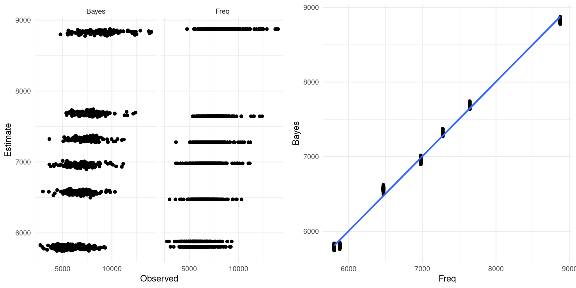 - The Maximum likelihood, i.e., we’re going to estimate \(p(y\vert \beta, X)\) which in the tables and the plots will be referred to as “Freq” from the term “Frequentist” which I inherently dislike but I made the tables and plots a while ago so bear with me.