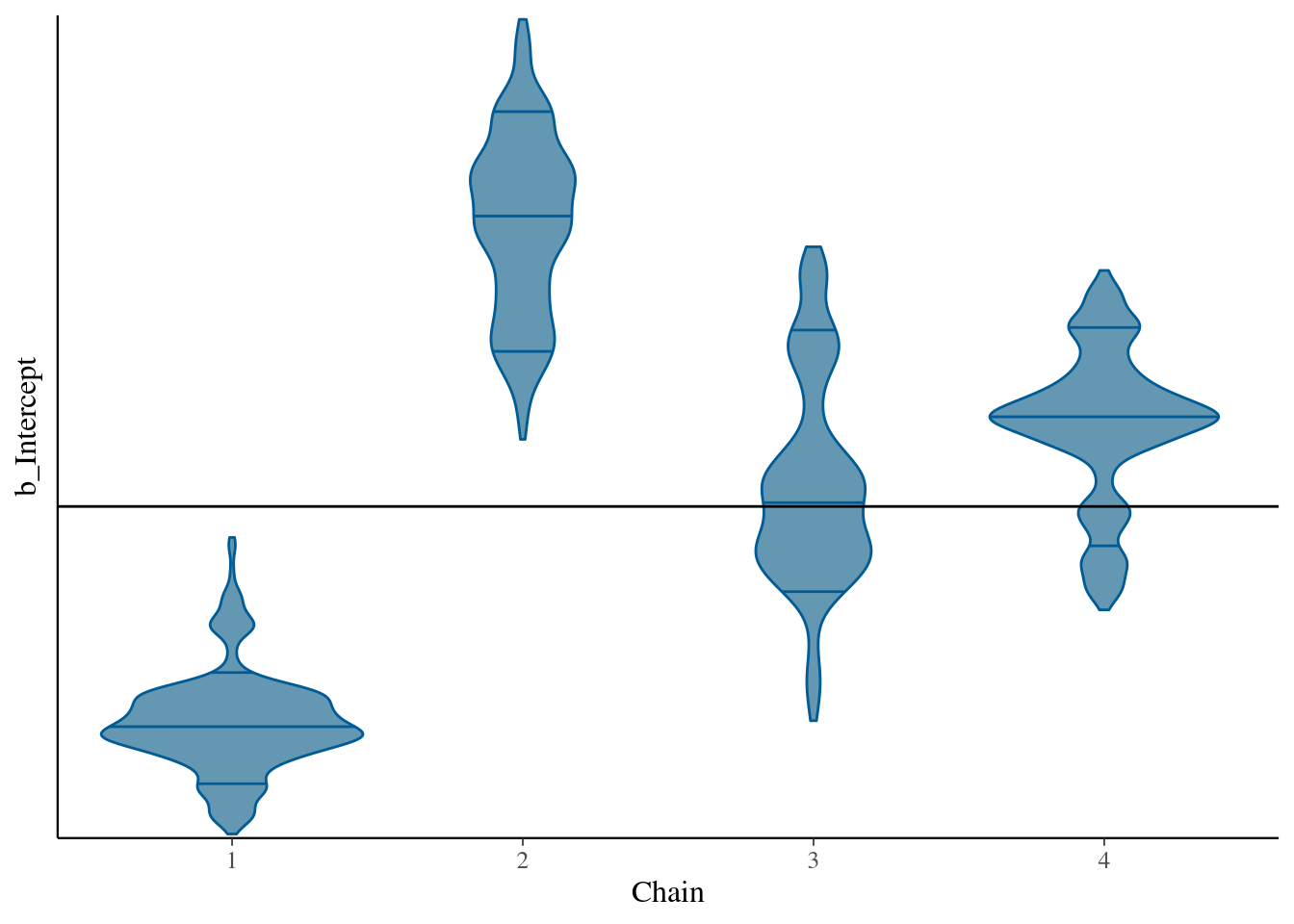 As you saw previously there’s way more support for different values of our parameters than the ML method shows us. To further visualize this we’ll take a look at the samples for the intercept \(\beta_0\) chain by chain using violin plots. They show the distribution on the y axis and the chain id on the x axis. As before the ML estimate is indicated by a black horizontal line. You can see that the ML approach only agrees with the expected value of chain number 2. The other support is completely ignored and not exposed to the user.