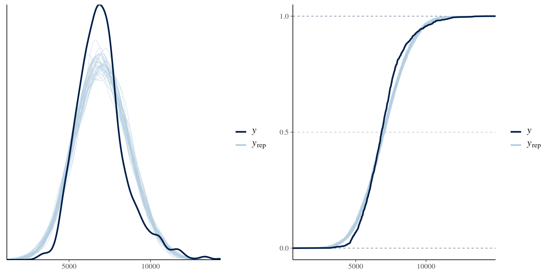 There is one more important check that we need to do and that’s a posterior predictive check just to make sure that we are not biased too much in our estimation. Again inspecting the density and cumulative distribution function below we can see that we’re doing quite ok given that we only have day of week as covariates in our model.