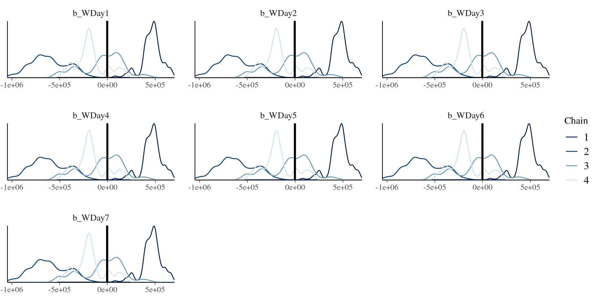 As you can see these estimates are quite different and to the naked eye makes more sense from what we know about the data set and what we can expect from intra-weekly effects. We can further check these estimates by inspecting the posteriors further. Note here the “bweekdayhat[1]” which is a delta distribution at 0. This serves as our baseline for the intra-week effect that we’re capturing. The x-axis in the plot are the estimated \(\beta_i\)’s and the y-axis for each parameter is the posterior probability density.
